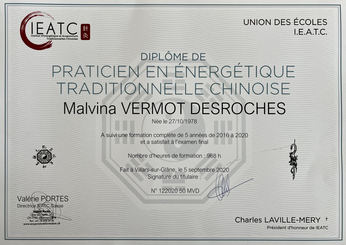- Diplômée de l’Institut d’Energétique et Acupuncture Traditionnelles Chinoises IEATC SUISSE, école créée il y a 40 ans dans la lignée de Charles Laville-Méry.