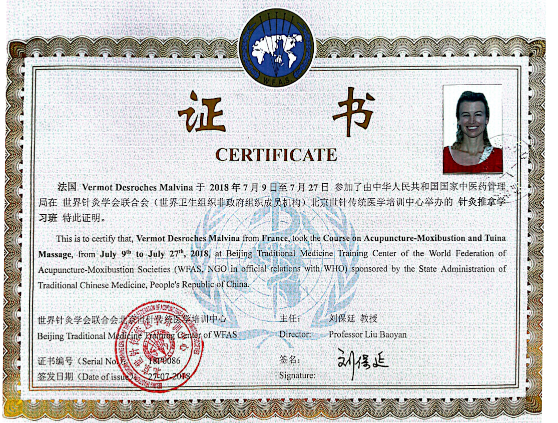 - Diplômée de l’Hôpital de Dongzhimen, Beijing (Chine) en association avec l’I.F.T.E.M institut de Bordeaux (France)
